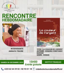 Rencontre hebdomadaire au Mali ( BAMAKO) Livre : La couleur de l’argent Auteure : Komara Constance Mariam Genre : roman Intervenante : Aminata Traoré Date